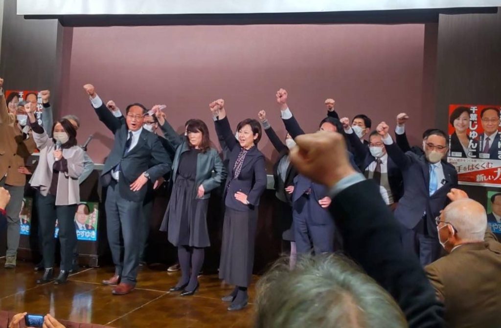 昨日、これまで新型コロナ禍で開催出来なかった、後援会総会が開催されました。高橋敏彦北上市長、内記和彦西和賀町長から祝辞をいただいた後、県知事選挙に出馬予定千葉じゅん子「新しい岩手をつくる会」代表と北上市長選挙に出馬予定の八重樫浩文さんが挨拶し、全員当選に向け頑張ろうコールしました‼️