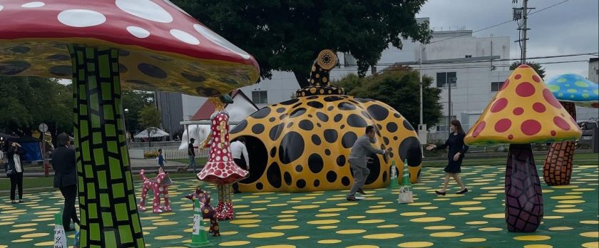 十和田市現代美術館は、野外公演展示を含めて現代アートを楽しめる施設で、平成20年の会館以来多くの来場者があり、昨年度は17万6,800人、内有料入場者は14万7,100人(入館料大人1,800円)あります。私達の訪問時も多くの外国人が来場してました。丁度表の官庁通りでは、祭が開催されるとあり、多くの屋台が出店していました。